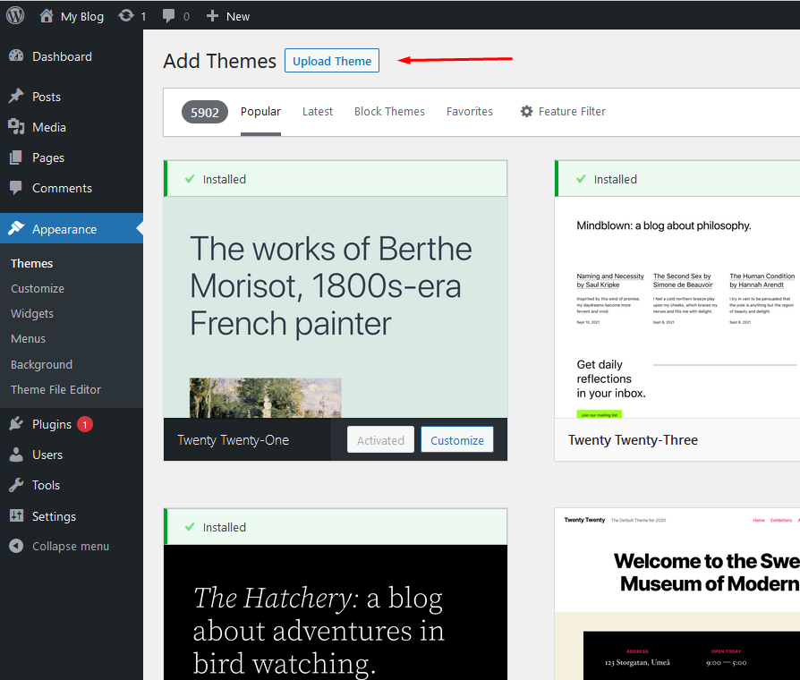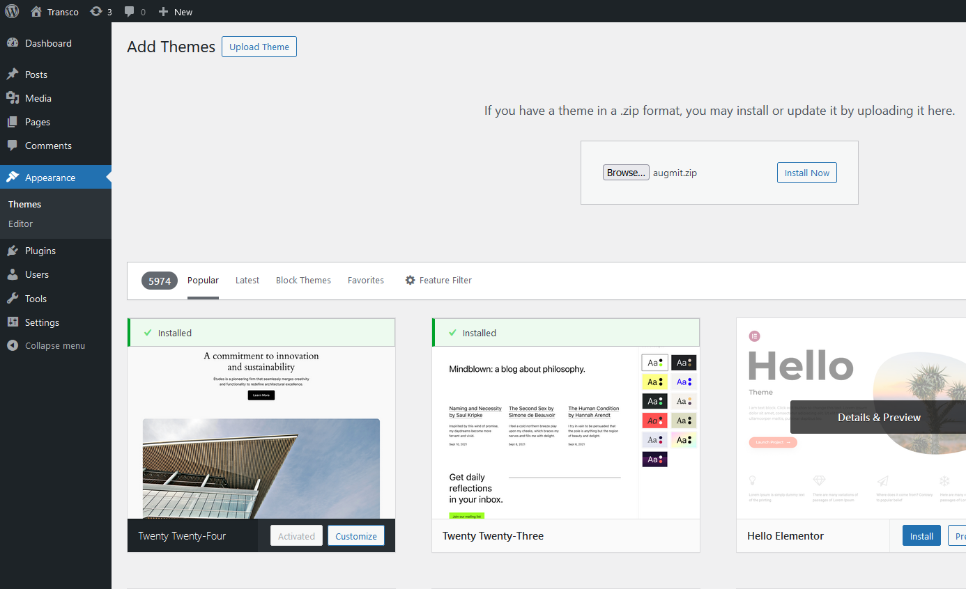 Note: When uploading your theme with the installer, please ensure you are uploading the theme .zip file, not the entire package you downloaded. In this case, you will be uploading Technova.zip.