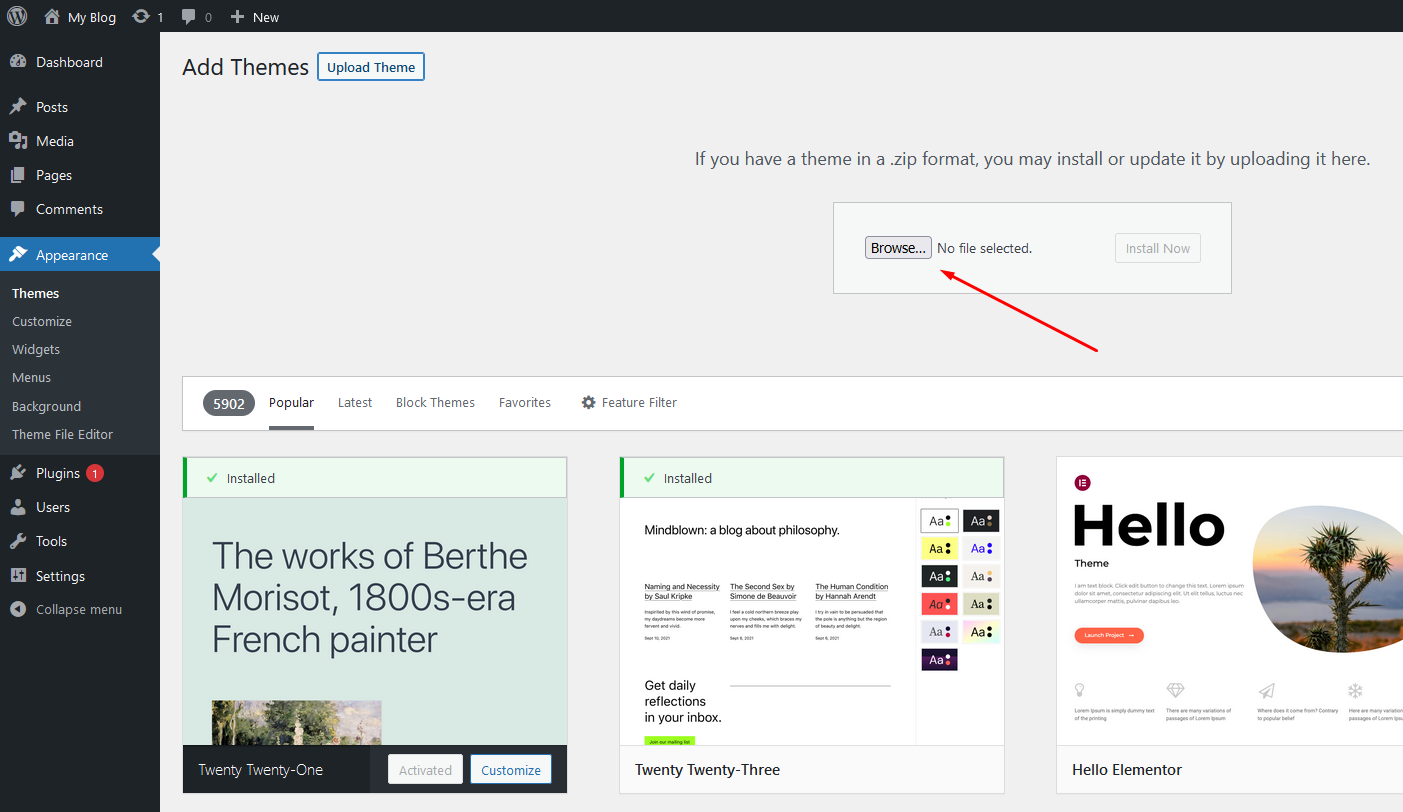 Note: When uploading your theme with the installer, please ensure you are uploading the theme .zip file, not the entire package you downloaded. In this case, you will be uploading Technova.zip.